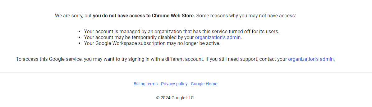 If you are experiencing an issue accessing the Chrome Web Store and receive the below message, it is likely you may be signed into Google Chrome with your Park University Google account. The Chrome Web Store is not accessible when logged into Google Chrome with your Park University Google account.